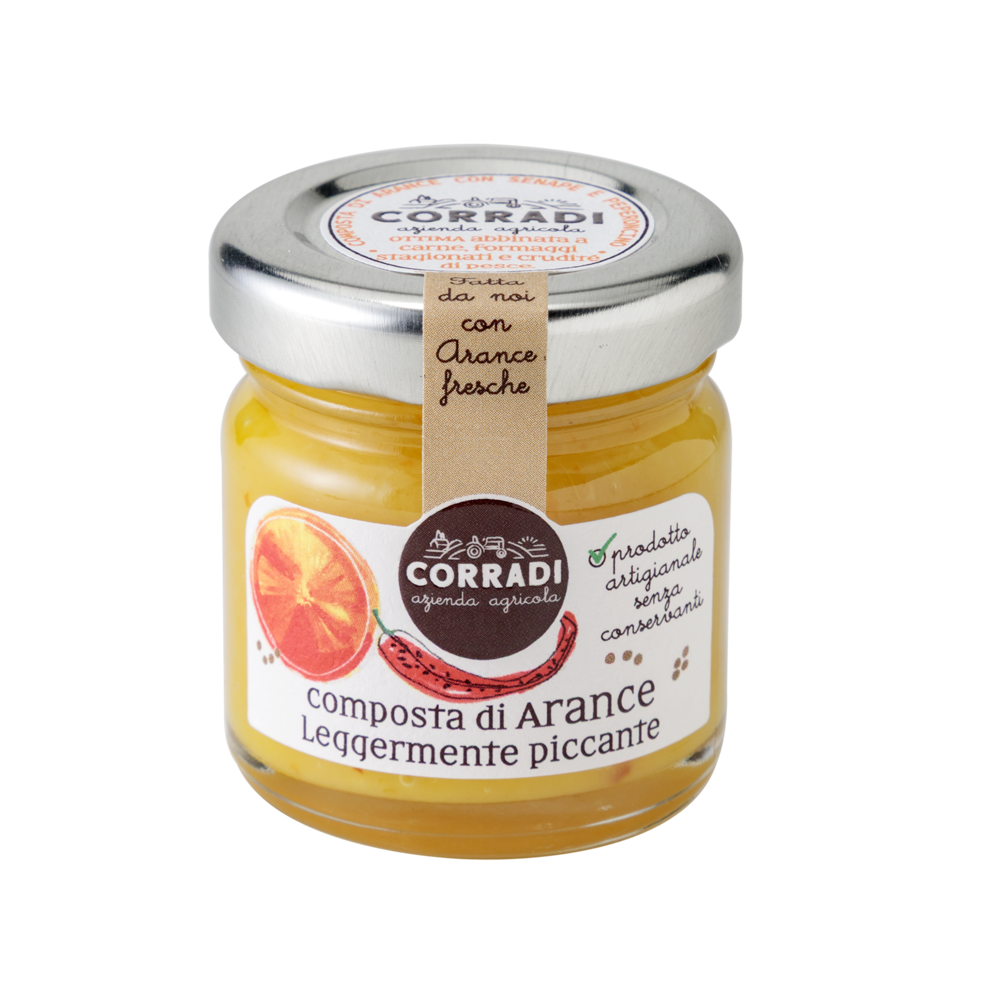 Arance (78%), zucchero di canna, aceto di mele, peperoncino (0,03%), essenza di senape (0,005%). Può contenere tracce di semi.
