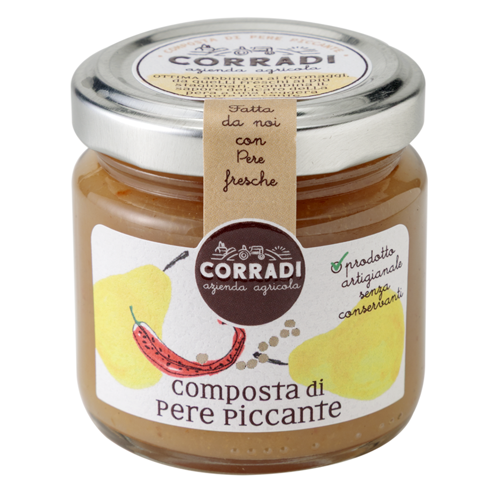 Pere (74,5%), zucchero di canna, succo di limone, peperoncino, essenza di senape.